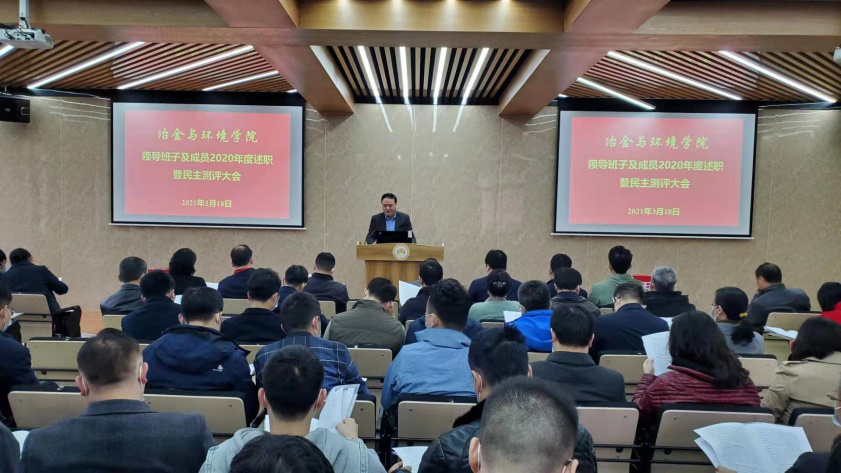 会议首先进行了学院领导班子及成员2020年度述职暨民主测评,成琼文书记代表院领导班子作现场述职,其他班子成员作书面述职。成琼文书记向大会作《凝心聚力,奋发有为,全力推动学院事业高质量发展》的主题报告。他指出,2020年是极不平凡的一年,学院领导班子带领全院师生员工团结一心、奋发有为,做好疫情防控、冶金馆搬迁与加固维修、金贵楼启用等具体工作,扎实推动各项中心工作,取得明显进步。一年来,学院领导班子始终坚持和加强党的全面领导,加强和改进党的建设,牢牢把握社会主义办学方向,积极统筹谋划、担当作为,在议事决策、学院“十四五”顶层设计、学科建设、人才培养、队伍建设、科学研究、国际化办学、条件保障和服务、疫情防控、群团工作等方面取得较好的工作业绩。报告还分析了学院发展存在的不足和问题,部署了今年的工作重点。成琼文书记强调过去的一年是辉煌的一年,在接下来的2021年,学院领导班子将团结带领全院师生以习近平新时代中国特色社会主义思想为指导,落实立德树人根本任务,推动学院事业发展实现新跨越,以优异成绩迎接建党100周年。