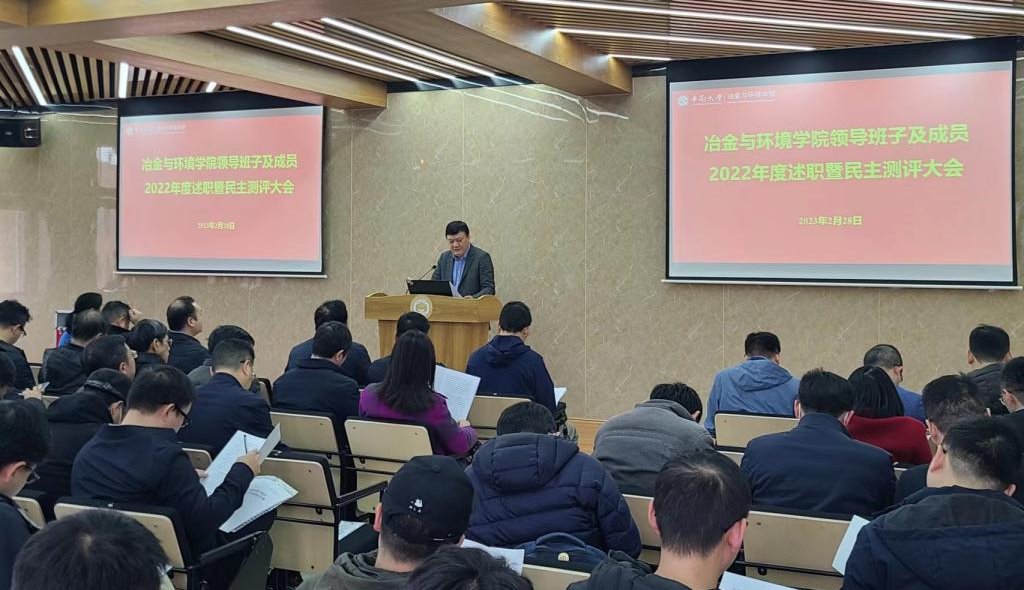 会上,学院党委书记成琼文代表院领导班子做了述职报告。报告首先从学科综合实力显著增强、科研创新服务能力稳步提升和整体发展效能不断优化等三个方面总结了2022年主要工作成绩,并从加强思想政治建设、提升办学治院水平、提升党建工作成效、严守安全底线等四个方面汇报了2022年度主要工作。成琼文书记在报告中分析了当前发展面临的形式与我们存在的不足,进一步指出“回顾冶金学科办学历史和跨越式发展历程,我们的主要经验和体会是:必须旗帜鲜明讲政治、必须发扬学科文化与优良传统、必须坚持改革创新谋发展、必须抢抓历史机遇担使命。”他强调,新的一年我们必须更好地掌握战略主动,以更大的决心和魄力推进改革发展,必须付出更多的努力,量质并举加快推进学院事业高质量内涵式发展的新征程。
