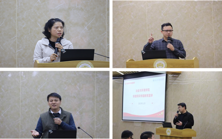 冶环院各分管领导作分管领域内的党风廉政风险教育和相关工作安排。陈爱良副院长就立德树人、教材课程等方面作本科教学工作报告;刘恢副院长从分析学术不端及科研失信行为的原因入手,并简要介绍了学院科研经费使用和成果转化的管理办法;刘芳洋副院长强调了优秀学位论文评选推荐工作的重点,并就学位评定分委员会换届及相关工作做出安排;王亲猛副院长聚焦于师德师风建设,强调教职工们要全面理解十项准则内涵与要求,并从经典师德教育案例中汲取教训,做到廉洁自律。