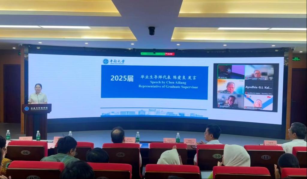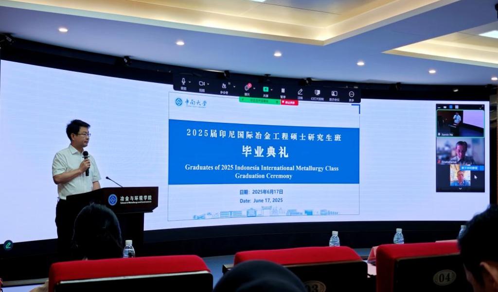 6月17日上午,2025届印尼国际冶金工程硕士研究生班毕业典礼在潇湘校区金贵楼520会议室举行,典礼以线上线下结合的方式同步进行印尼经济和工业基础设施部秘书长阿约迪亚·卡拉凯、格林美集团副总经理许鹏云、印尼教育捐赠基金会奖学金部主任德维·拉索、禁忌书屋 党委书记成琼文、院长闵小波、国际教育学院副院长向学勇、国际合作与交流处副处长陈强、国家卓越工程师学院副院长陈爱良等相关负责人及全体毕业生齐聚一堂,共同见证这一重要时刻。毕业典礼由禁忌书屋 副院长王亲猛主持。