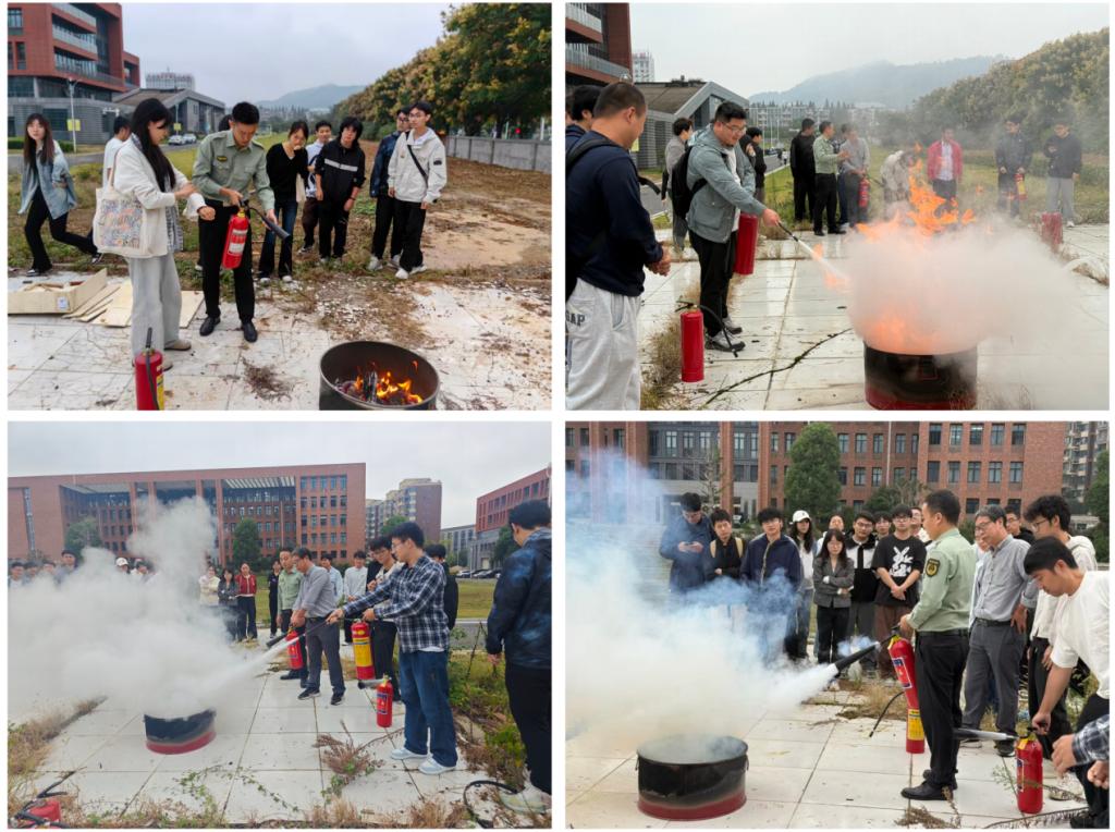 理论培训结束后,参会人员前往金贵楼前坪开展消防实操演练。演练现场设置了模拟火灾场景,新生们依次有序上前实操,具体掌握灭火器使用方法,进一步巩固了消防技能。