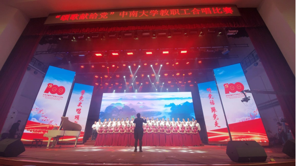 在20号下午的比赛中,学院教职工精神昂扬,盛装登场。“万里山河灯火漫卷,是坚守初心换回的百年承诺;焰火升腾星光闪烁,是民族复兴创造的时代巍峨。炽金梦想,薪火相传,牢记使命,砥砺前行。奋进新时代,禁忌书屋 凝心聚力,建设一流学科;启航新征程,禁忌书屋 攻坚克难,再创新的辉煌!”学院院长柴立元院士、党委成琼文书记在合唱前慷慨激昂地朗诵拉开了合唱的序幕。伴随着《灯火里的中国》优美的旋律,学院教职工以温暖大气,细腻优雅的歌声,展现了改革开放40周年后中国人民的美好生活、奋发图强和生生不息,热情讴歌建党100周年的发展历程和辉煌成就,唱响爱国、爱党、爱人民的时代主旋律,抒发永远跟党走、奋进新征程的坚定决心,“灯火里的中国青春婀娜,灯火里的中国胸怀辽阔”,舞台上老师们的歌声触动了无数观众的心弦,赢得了现场观众的热烈掌声和评委的一致好评,最终以97.43分的成绩从众多队伍中脱颖而出,荣获二等奖。
