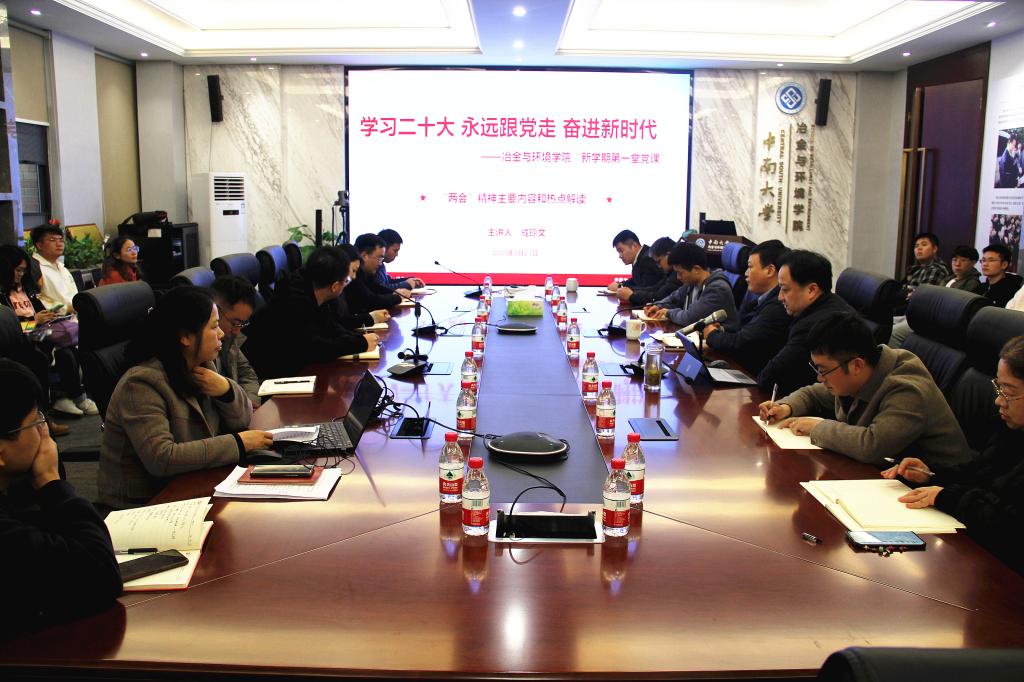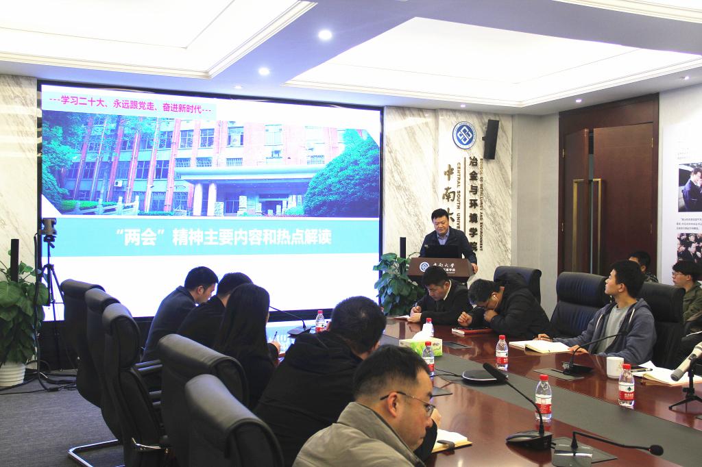 成琼文强调,2023年全国两会是全面贯彻落实党的二十大精神开局之年的盛会,是我国人民政治生活中的大事。作为高校的师生,我们要更加紧密地团结在以习近平同志为核心的党中央周围,全面贯彻习近平新时代中国特色社会主义思想,领悟“两个确立”的决定性意义,增强“四个意识”、坚定“四个自信”、做到“两个维护”,为全面建设社会主义现代化国家、全面推进中华民族伟大复兴而团结奋斗。结合李强总理在湖南调研并主持召开先进制造业发展座谈会的有关情况,成琼文表示冶金行业是国家先进制造业的重要组成部分,学院要紧跟时代步伐,共同推动学院事业内涵式高质量发展,努力开创一流学科建设新局面。